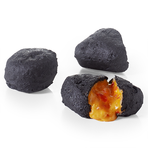 L'en-cas au fromage le plus accrocheur de la planète. Vous êtes sûr d'attirer l'attention lorsque vous mettez ces nuggets noirs au chili et au cheddar avec du piment jalapeno sur votre menu. Des pépites de fromage épicées recouvertes d'une couche de tempura noire.