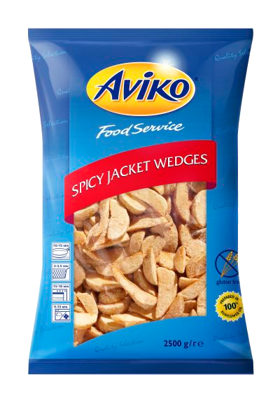 Aviko Spicy Jacket Wedges zijn diepvriesaardappelpartjes met schil en kruiden.